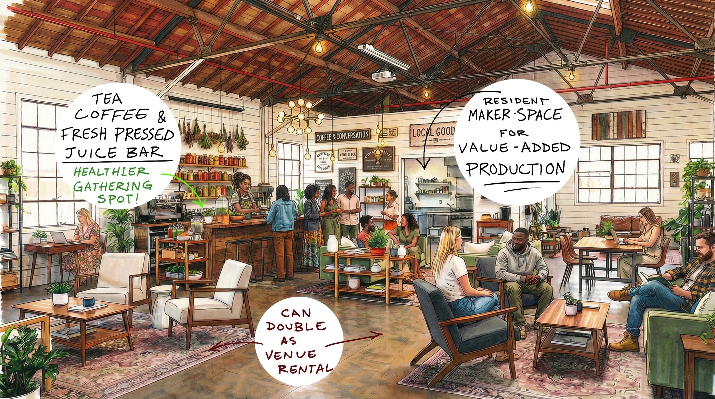 Third places. Courtyard, farm stand, event venue — where community happens.