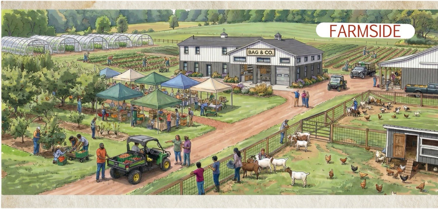 Working farm. BAG & CO provides farm share access, events, and revenue.