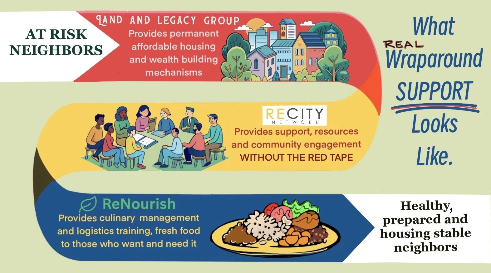 Land and Legacy Group provides the foundation: permanent affordable land through the community land trust model, removing property from speculative markets so families can build equity without fear of displacement. Skip Gibbs is also the Executive Chef of Renourish, managing the program’s food related efforts